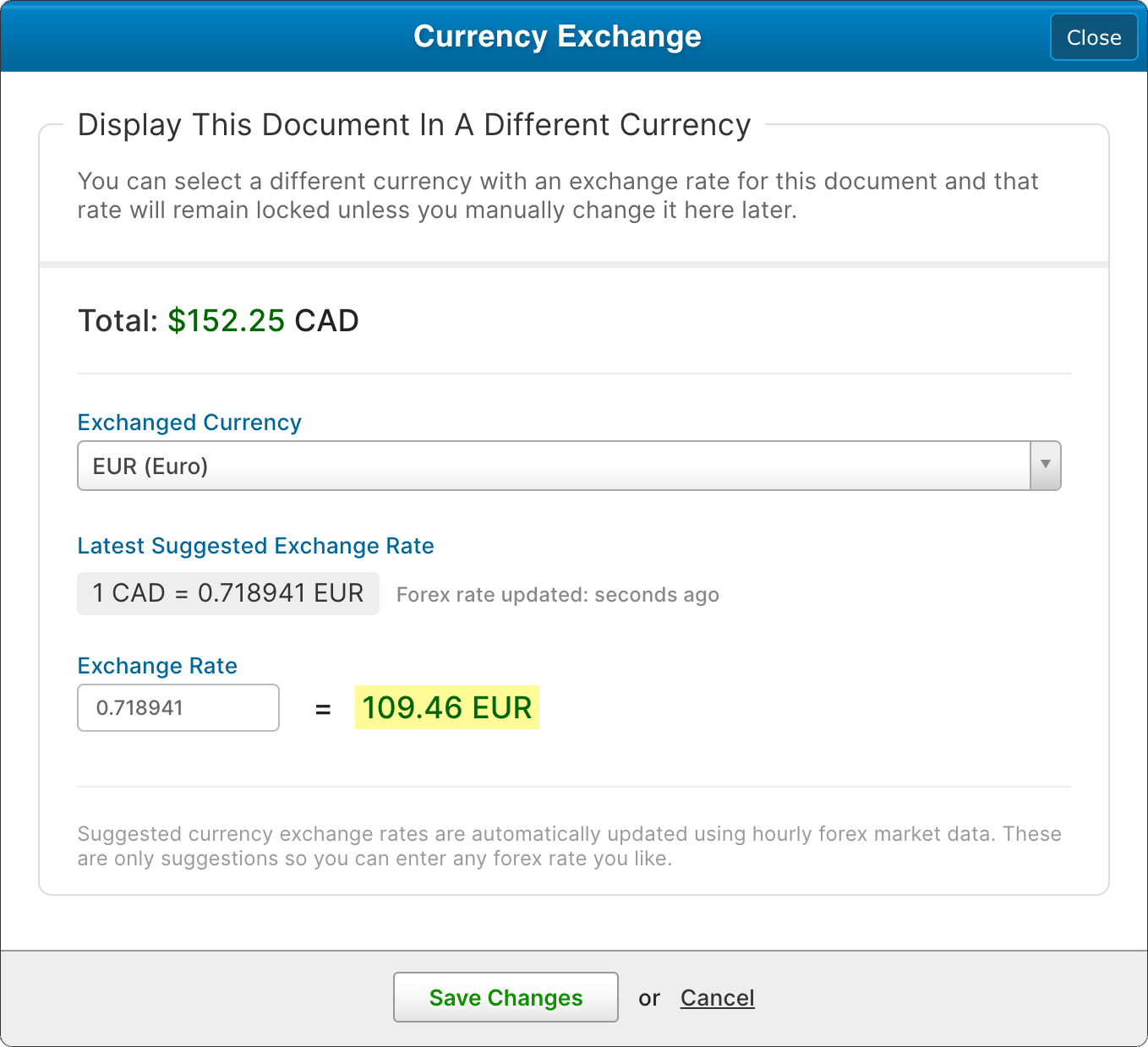 You can also update a document's exchange rate or even swap that out for a different currency altogether.