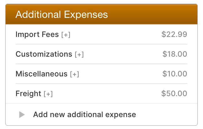 Enter extra expenses associated with each inventory unit (such as repairs or importing fees) so you can keep track of your real expenses.